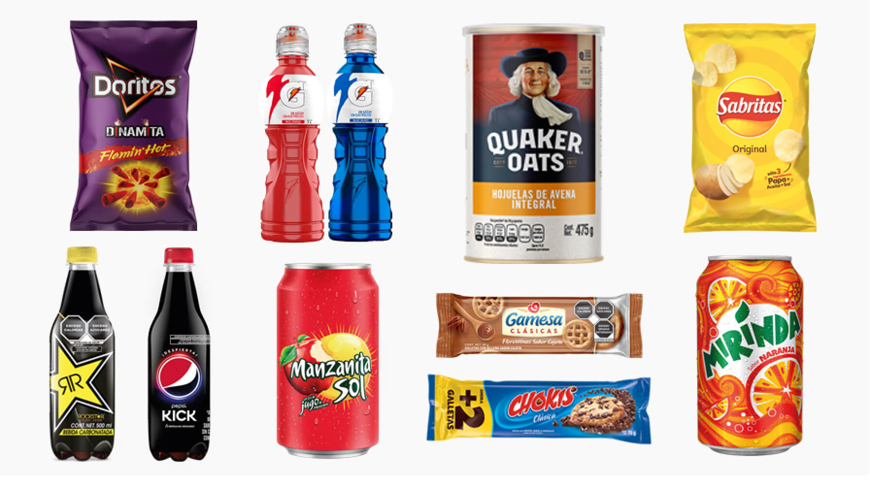 Snacks and drinks Mexicans love make up the menu of our brands, including Pepsi, Sonrics, Gamesa, Gatorade, Mirinda, Quaker Oats and more. Cool off with a Gudapop made in Toluca or wake up your taste buds with Sabritas chips spiced with adobadas from Mezclas.